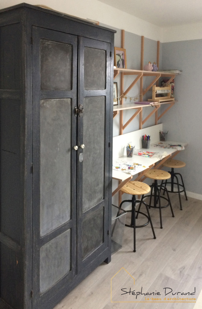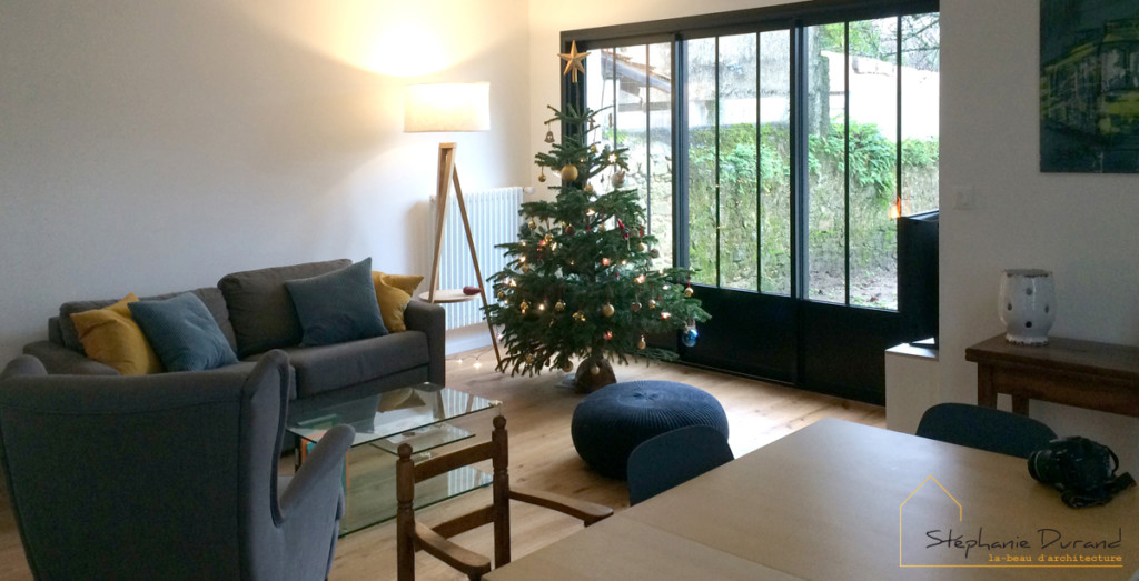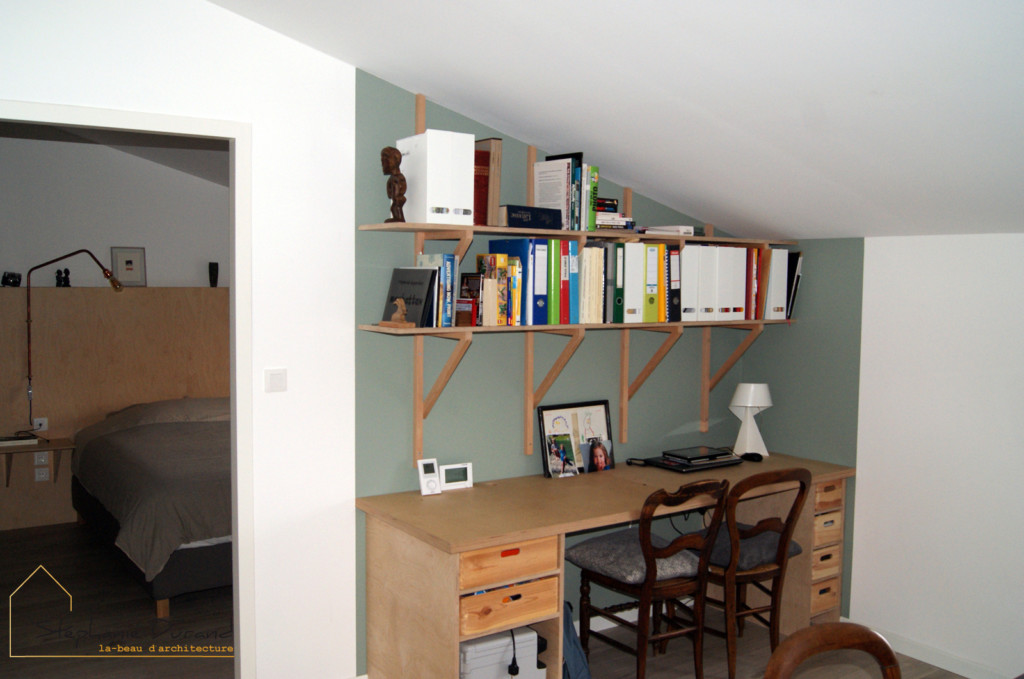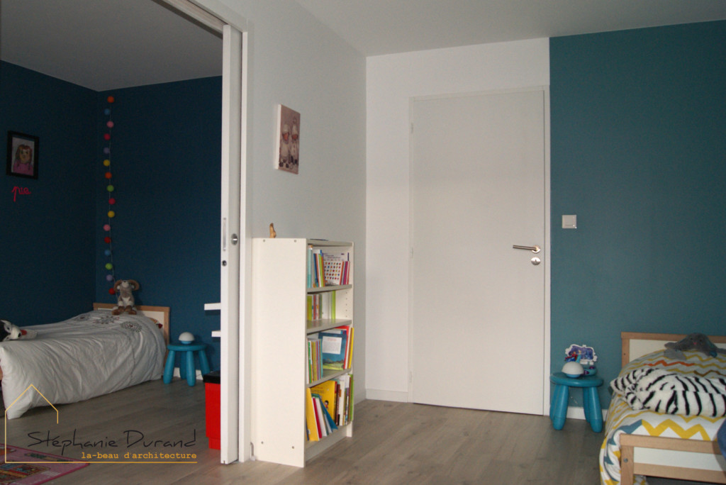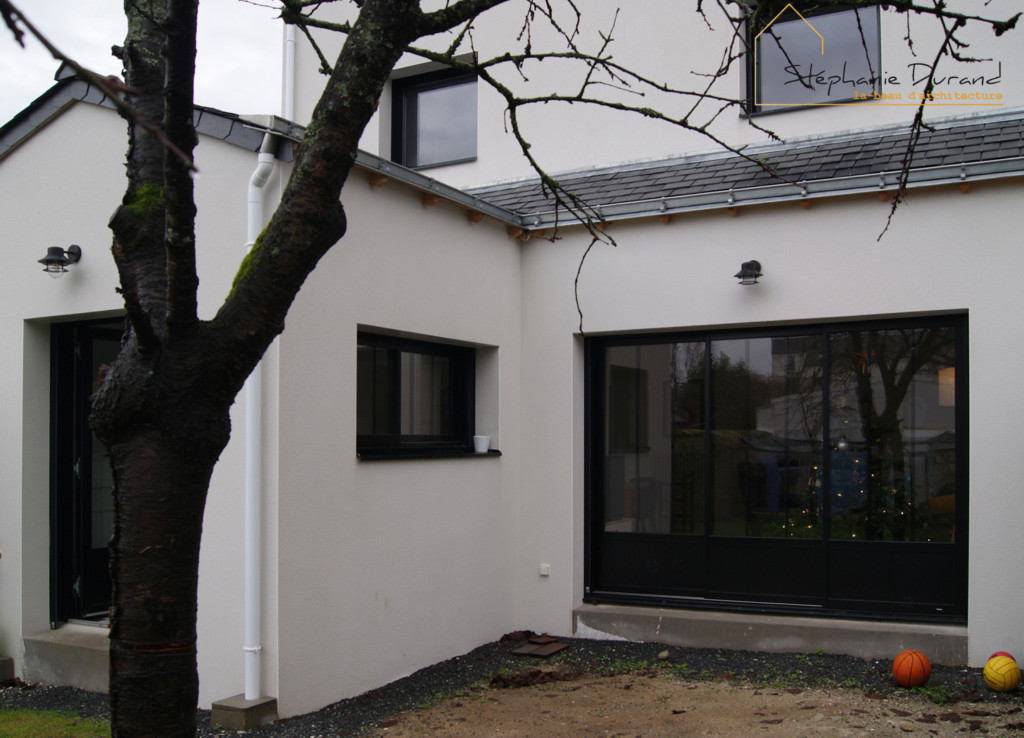 Une famille nantaise souhaitait acquérir un terrain afin d’y construire une maison pour eux 5, ils ont trouvé une vieille bâtisse à démolir pour y construire à la place, une maison neuve, avec 5 chambres, un bureau, deux salles de bain, une cuisine et un salon. Un garage pour deux voitures les isolent de la rue. Les pièces de vie s’ouvrent sur le jardin et les murets en pierre conservés. la patine bleue reste visible !