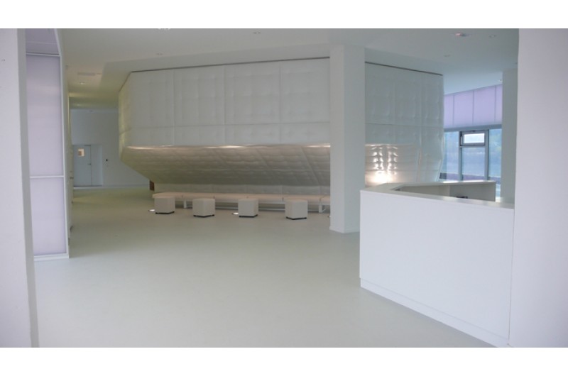 Les façades sont habillées de polycarbonate coloré. Les circulations et locaux techniques implantés au nord permettent d’assurer un effet « tampon » par rapport aux nuisances acoustiques de l’équipement sportif.