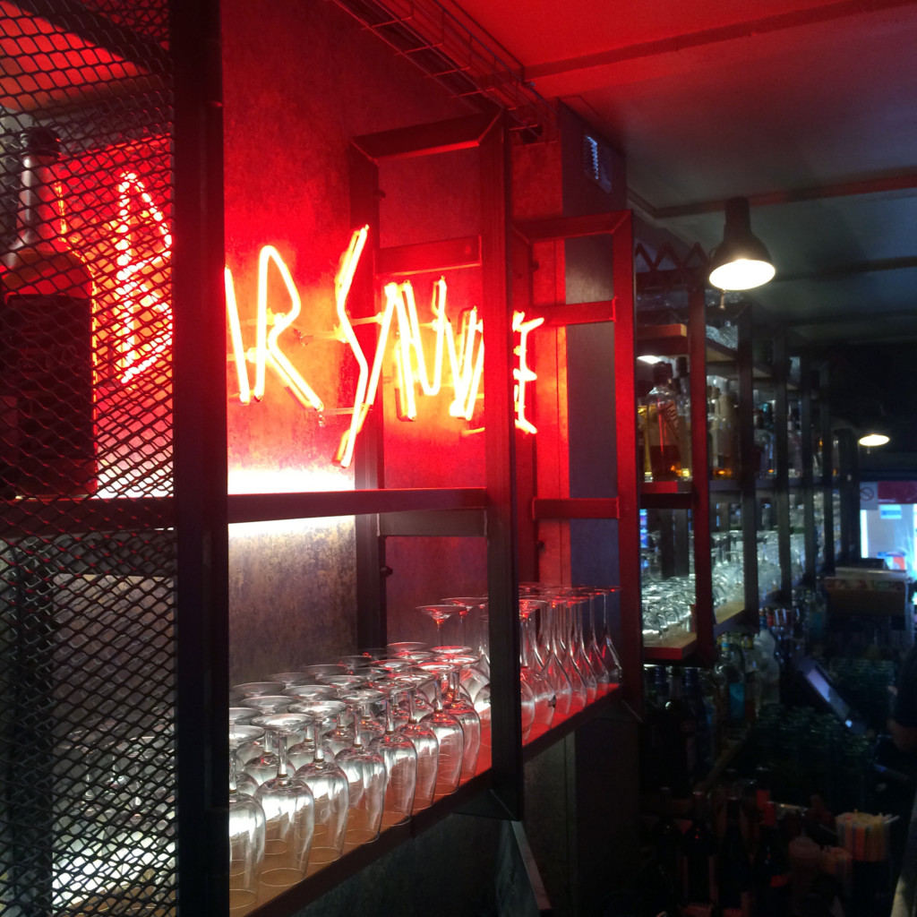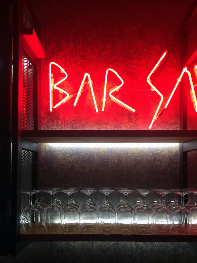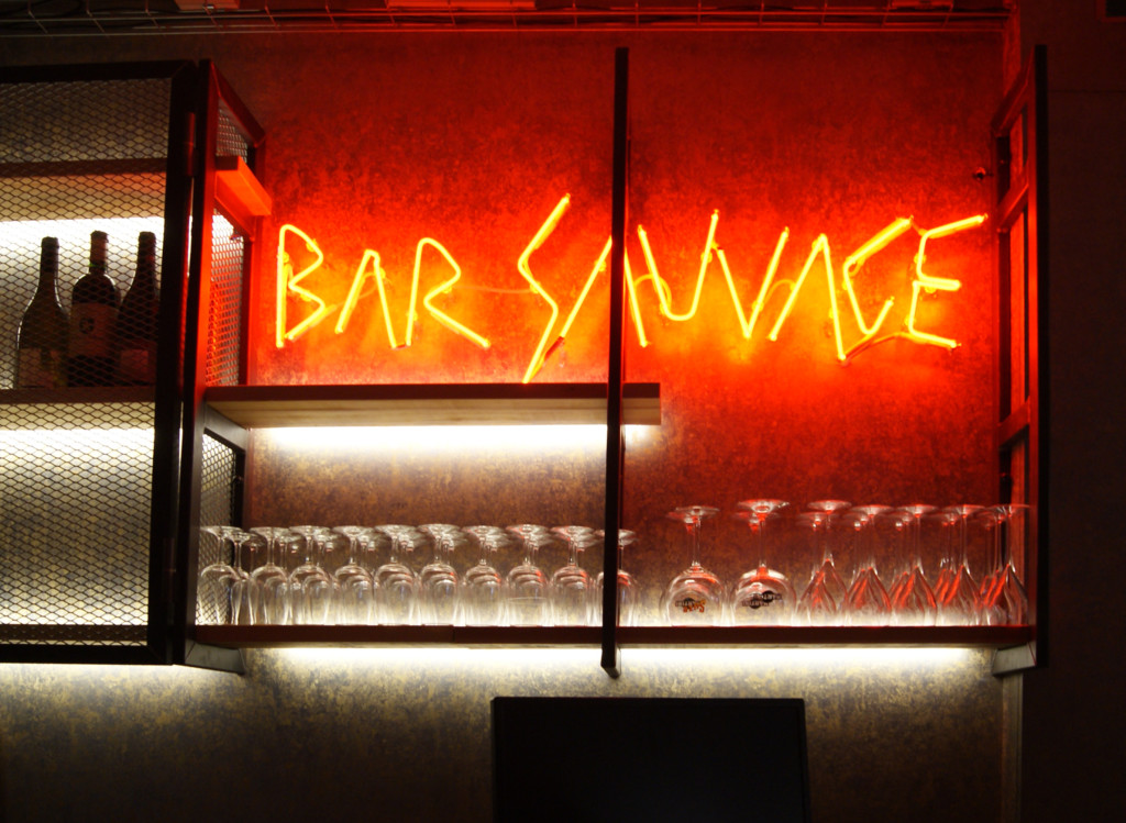 la jupe du bar est réalisé en bois brulé, selon la technique japonaise un procédé vieux comme le monde de bois brûlé, la technique du Shou Sugi Ban ou « Cyprès Brûlé ». Qui brûlera verra ! nous avons pensé aux crochets pour les vêtements des clients et aux prises afin qu’ils puissent recharger téléphone, tablette et ordinateur.